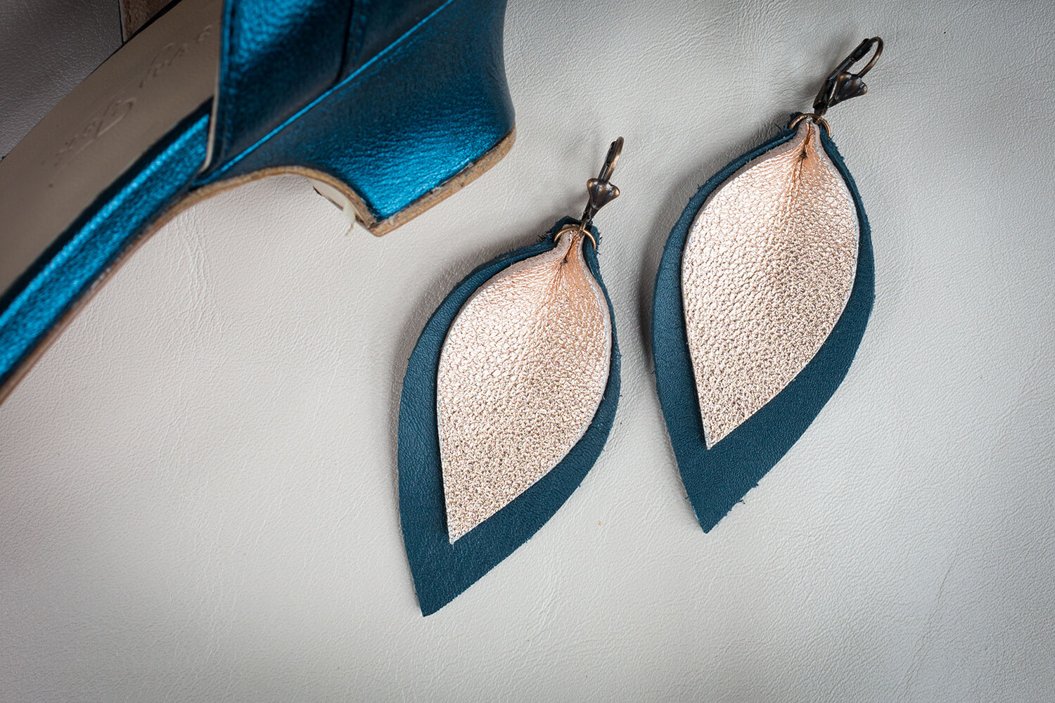 A beautiful set of fine leather earrings to match and complement your favorite Groovy Fox shoes. This is the ideal use of the leftover pieces of leather from the production of our shoes, crafted with our own hands and tons of love and passion. By upcycling leftover leather scraps, we strive to reduce our waste and contribute to a greener planet. Your fashion choice can make a difference! The Velvet Blue/Rose Gold Leaf earrings come in two sizes – the leather part is approx. 7 x 3.5 cm /5.5 x 2.7 cm. Alternatively, we might be able to make customized leather combinations and/or sizes, depending on the pieces of leather we have available. Drop us a message and we will do our best to fulfill your wishes.