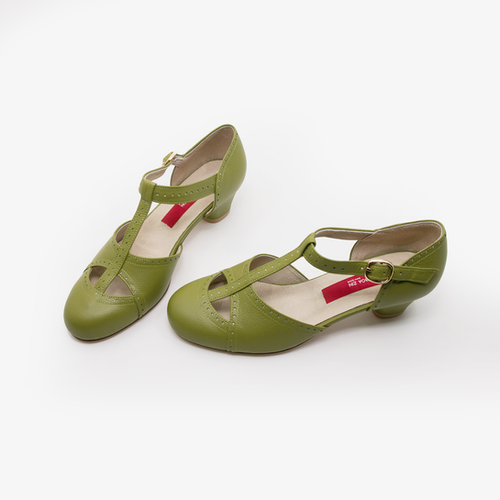 皮革,抹茶绿山羊皮,鞋跟高度分别为 3 厘米、4 厘米、5 厘米和 6 厘米 - 光泽度 ★☆☆☆☆ 柔软度 ★★★★☆ 耐用性 ★★★★☆ 颜色 ★★★★★